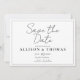 Zeitloser Stil, unvergessliche Ankündigung. Diese schlichte, handgeschriebene Schriftzeichen-Schwarz-Weiß-Save the Date-Karte ist auf einem knackigen, minimalen Layout gestaltet - ideal für Paare, die einen modernen, eleganten Weg gewollt haben, ihren großen Tag zu verkünden. Dieses Design ist vollständig mit Ihren Namen, Datum und Ort abgestimmt und eignet sich ideal für feierliche Hochzeiten, minimalistische Themen oder Veranstaltungen mit schwarzer Krawatte. Raffinesse machte einfach.