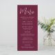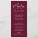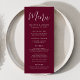 Einfaches Hochzeitsmenü mit "Menü", das in einem weißen Skript mit bordeauxfarbenem Hintergrund angezeigt wird. Personalisieren Sie das burgundische Hochzeitsmenü, indem Sie Ihre Namen, das Hochzeitdatum und Menüinformationen hinzufügen. Entworfen, um mit unserer Simple Script Hochzeitskollektion zu koordinieren.