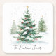 Niedlicher Weihnachtspapier-Untersetzer für Weihnachts-Party oder Barware mit einfachem Skriptfamilie-Namen und einem Aquarellwein Weihnachtsbaum mit Schnee.