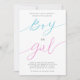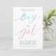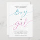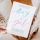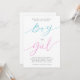 Einfache und moderne Gender-Party Einladung-Template-Karte mit elegantem Drehbuch, das "Junge oder Mädchen" in Rosa und Blau sagt. Passen Sie dieses Produkt an, indem Sie Ihre Babydusche-Informationen hinzufügen.