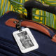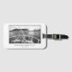 Gepäckmarke mit Schwarz-Weiß-Bild eines Fischerbootes, das von der Table Bay aus den Hafen von Kapstadt mit Blick auf den Tafelberg einfährt.