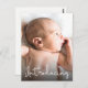 Personalisiert mit dem Foto Ihres Babys auf der Vorderseite und einer besonderen Nachricht auf der Rückseite. Dieses Design nutzt einen handgezeichnet Script-Schriftart für eine Touch von Eleganz. Äußern Sie Ihre Begeisterung, wenn Sie die Geburt Ihres Kindes ankündigen, und senden Sie gleichzeitig Ihre Dankbarkeit. Das Wort "Einführung"-Overlay ist in einem modernen, weißen Schriftart-Overlay und einer schwarzen Transparenz enthalten, um die Lesbarkeit des Overlays über der Foto-Auswahl behalten.