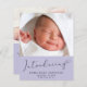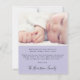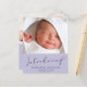 Eine einfache und niedliche, preisgünstige Pastellton lila Baby-Geburtsankündigung. Die Vorderseite zeigt das Foto Ihres Neugeborenen, den vollständigen Namen, das Ankunftsdatum und die Geburtsdaten sowie "Einführung" in einem stilvollen Skript, das mit einem geblüht Herz endet. Auf der Rückseite können Sie ein zusätzliches Foto, Elternnamen und Geschwisternamen hinzufügen, und ein Dankeschön, Besuchen oder eine andere Nachricht.