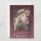 Moderne und schicke Foto-Graduiertenparty mit dem Senior-Foto Ihres Absolventen mit einem eleganten Drehbuch-Schriftart und Imitate Goldfolie Konfetti vor einem maronen Aquarellhintergrund. Personalisieren Sie die Einladung mit dem Klassenjahr, dem Namen und der Schule Ihres Absolventen auf der Vorderseite. Fügen Sie die Details Ihrer Graduierungsparty auf der Rückseite hinzu.