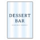 Dieses Hochzeitstisch-Schild verfügt über ein sauberes, minimalistisches Design mit vertikalen Streifen in sanften Blautönen, das eine beruhigende und einladende Atmosphäre schafft. Die kühne Serifenschrift für "DESSERT BAR" wird durch eine freundliche sans-serif-Nachricht darunter ergänzt, die die Gäste dazu ermutigt, sich frei zu bedienen. Das einfache Layout betont Klarheit und Eleganz und ist somit perfekt, um die Gäste zu den süßen Köstlichkeiten auf Ihrer Veranstaltung zu führen. Der moderne Stil und die beruhigende Farbpalette verleihen einen Hauch von Raffinesse, während sie eine zwanglose Atmosphäre beibehalten, die ideal für jede Dessert-Station ist.