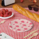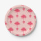 PapierTeller in einem Digital-Zeichnen einer eingemachten Sagopalme in einem dekorativen Pflanzer - tiefes korallenrotes Rosa mit einem korallenroten rosa Pastellhintergrund