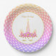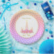 Einhorn, Blume, goldene Konfetti auf pastellfarbenen mandala Hintergrund Papierplatte. Geburtstagstext kann personalisiert sein.