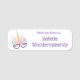 Namensschild mit einem glücklichen Einhorngesicht mit Gläsern. Dieser Namensumbau ist eine Spaßwahl für Kinder' Wissenschaftslager oder Herstellerprogramm mit einer wunderlichen Drehung oder jedes mögliches Ereignis, das eine Richtung von geekiness oder Liebe der magischen Fantasie hat. Alle Wörter sind kundengerecht. Wenn Sie eine andere Form für diesen Umbau wählen, muss möglicherweise das Wort- und Einhorngesicht für den besten Sitz herum verschoben werden.