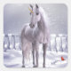 Ein schneeweißes Einhorn mit einer langen, fließenden Mähne und einem goldenen Horn steht in diesem digitalen Kunstwerk des Künstlers Jayne Wilson im sanft fallenden Schnee.