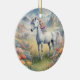 Ein Keramik-Ornament, das ein traumhaftes Bild eines weißen Einhorns mit einer Regenbogenmane zeigt, die in einem Feld von Blume stehend ist. Im Hintergrund sind majestätische Berge. Das perfekte Geschenk für diejenigen, die Liebe magische und mystische Einhörner. Enthält generativen Inhalt.