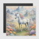 Eine Magnetkarte, die ein traumhaftes Bild eines weißen Einhorns mit einem in einem Feld von Blume stehenden Regenbogenmane zeigt. Im Hintergrund sind majestätische Berge. Das perfekte Geschenk für diejenigen, die Liebe magische und mystische Einhörner. Enthält generativen Inhalt.