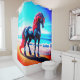 Dieser Duschvorhang hat ein Einhorn, das darauf abgebildet ist.