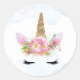 Runde 3" Einhornkleber - mit glitzerndem Gold einhornhorn und langen Einhornaugen.