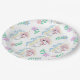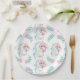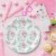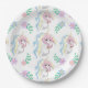 Das Design zeigt ein nahtloses Muster von majestätischen Einhornköpfen mit pastellfarbenen, fließenden Mähnen in Rosa-, Blau- und Gelbtönen, die mit Glitzern verziert sind. Die Einhörner haben ausdrucksvolle Augen und goldene Hörner, die ihnen ein magisches und elegantes Aussehen verleihen. Sie sind von zarten Blume umgeben, die in Rosa, lila und Blau gehalten sind und von grünen Zweigen begleitet werden. Der weiße Hintergrund hebt die lebendige und skurrile Ästhetik des Musters hervor und macht es verträumt und bezaubernd.
