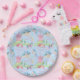 Das Design zeichnet sich durch Einhörner in verschiedenen Posen aus, einige mit fließenden Flügeln und Manen, andere stehend elegant aufrecht, wunderschöne rosa Märchenschlösser mit Türmen und Fahnen Set auf sanften grünen Hügeln, und zarte pastellfarbene Regenbögen, die über das Design laufen, was die magische Atmosphäre. Das Design ist voll von zarten Wolken, sanften grünen Bäumen, rosa Blume und schwimmenden Nelken. Das Design dominiert durch sanfte Pastellfarben mit hellblauem Hintergrund, wodurch die Elemente in einer traumhaften und wunderbaren Weise hervorstechen.