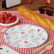 Das Design ist ein nahtloses Muster mit stilisierten Einhornköpfen mit fließenden, pastellfarbenen, in Rosa-, Gelb- und Blautönen gehaltenen Mäusen, die mit Glitzern verziert sind. Die Einhörner haben weiße Gesichter und goldene Hörner, die ihr magisches Aussehen noch verstärken. Rund um das Hotel befinden sich große rosa Herzen sowie rosa und gelbe Blumen mit grünen Blätter. Alle Elemente sind Set auf weißem Hintergrund und erzeugen einen skurrilen und traurigen Look.