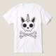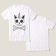 Dieses grafische Kunstwerk verbindet das whimsical und das makabre, mit einem stilisierten Schädel mit großen, ausdrucksstarken Augen, einem Einhorn und katzenartigen Ohren. Wie man an Sophie's T - Shirt sieht, wird der Schädel von Kreuzknochen begleitet, was seine spielerische, aber gotische Anziehungskraft verstärkt. Das Design verwendet ein einfaches Schwarz-Weiß-Farbschema, das den Fettdruck und die grafische Beschaffenheit der Illustration betont. Diese einzigartige Mischung macht es zu einer perfekten Wahl für alle, die eine Mischung aus Fantasie, dunklem Spaß und minimalistischer Kunst schätzen.