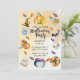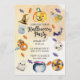 Diese Halloween-Einladung zeigt ein Layout im Wasserfarben-Stil mit verschiedenen thematischen Illustrationen, darunter einem ausgehöhlten Kürbis oben, Süßigkeiten, Fledermäuse, eine Flasche mit Trank, Totenköpfe, ein Gespenst, einen Kessel und andere klassische Halloween-Symbole, die um den Textbereich herum angeordnet sind. Der mittlere Abschnitt enthält anpassbare Details zur Veranstaltung wie Datum, Uhrzeit, Ort und RSVP-Informationen, die alle vor einem hellen, texturierten Hintergrund stehen, der das Kunstwerk hervorhebt.