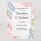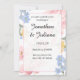Delikate und charmante Hochzeitsreise mit Blumen und sanften pastellfarbenen Blume in Rosa, Blau und Gelb. Das elegante Layout hebt die Namen der Paare in einem anmutigen Script-Schriftart hervor, gerahmt von einem subtilen rosa Rahmen. Ideal für Hochzeiten im Frühling und im Sommer, verbindet diese Einladung romantischen Stil mit einem frischen Gartenthema. Vollständig anpassbar, um Ihre Veranstaltungsdetails einzubeziehen, und somit die perfekte Wahl für eine klassische und zeitlose Hochzeitsankündigung.