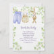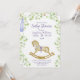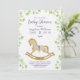 Eine Babyduscheinladung mit niedlichen Babykleidern, die an einer Wäscheleine hängen, einem niedlich gestopften Hasen, einem hübschen Rockpferd und all diesen Gegenständen umgeben von zarten Ästen mit hellgrünen Blätter.