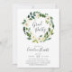 Elegante blumengeschmückte Partyeinladungen mit einem Kranz aus weißen Rosen in Aquarelltönen und Pfannkuchen mit üppig grünem botanischem Blattwerk und Blätter umkreisen "grad Party" in schicker handgeschriebener Schrift. Personalisieren Sie mit Ihren Abschluss Feierlichkeiten Details unten.