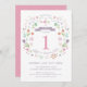 Diese hübsche und elegante Einladung zum ersten Geburtstag bietet einen illustrierten Blumenkranz mit den Worten "Let's Celebrate" um die Nummer 1. Die Textfarbe, der Schriftart und die Nachricht können nach Ihren Wünschen geändert werden. Auf der Rückseite des Einladens befindet sich ein rosa Hintergrund (der in eine beliebige Farbe getauscht werden kann) mit einem weißen Quarterfolienmuster. Ein idealer Weg, um die Gäste zum Geburtstag eines Mädchens einzuladen.
