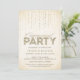 Das Design der Gepunkteten Olive™ Einladungsparty bietet einen hübschen Hintergrund aus weichem Gold mit einem Bild von funkelnd Edelsteinen, die von oben strömen, und dem Wort "Engagement Party", das mit dem Wort "Party" gefüllt ist, das mit einem Glitzer aus Gold gefüllt ist. BITTE BEACHTEN SIE: DIESES DESIGN BIETET NUR EIN DRUCKENDES BILD VON GLITZER; ES GIBT KEINEN PHYSISCHEN GLITZER, DER VERWENDET ODER INKLUSIVE IST; ES GIBT KEINE EMBELLISHIERUNGEN. Copyright 2013-Present | Der Gepunktete Olive™ | Alle Rechte vorbehalten