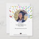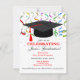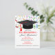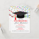 Feierliche GRADUATION Party Einladung mit farbenfrohen Bändern und einem traditionellen schwarzen Mütze mit rotem Tassel. Bearbeiten Sie beide Seiten dieser Einladung.