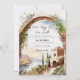 Diese Hochzeitseinladung zeigt eine griechische Landschaft eines Bauwerks, das auf einer Klippe erbaut wurde und das Mittelmeer nah zu Sonnenuntergang überblickt. Das Design umfasst auch die lokale Archipelagstruktur des Ortes.