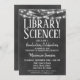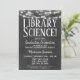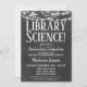 Eine lustige Schwarz-Weiß-Chalkboard-Bibliothek Wissenschaftsabschluss-Party Einladung mit Glühlicht an der Spitze.