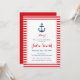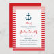 Moderne Babydusche Einladung mit rot gestreiftem Hintergrund und Ankerillustrierung.