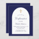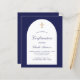 Ein marinierter Hintergrund und ein weißer Bogen. Personalisieren und einen Namen und Zeremonie Details. Elegantes handgeschriebenes Stilskript. Zurück: marineblau Hintergrund.