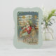 Hier kommt der Weihnachtsmann! Er lenkt seine phantastische Flugmaschine durch den Nachthimmel. Sterne, Raster und extravagante Dekorationen bedecken das Flugzeug und seine Ladung an wunderschönen Spielzeugen für den Weihnachtsmorgen. Das restaurierte Bild einer Viktorianischen Postkarte weist einen frostigen Hintergrund, goldene Akzente und schöne, helle Farben auf. Es ist gerahmt in Ziern und Ziergegenständen mit einem Weihnachtsdorf im Hintergrund.