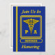 Diese blaue und goldene Einladung ist auf der Vorderseite mit dem Schild des pensionierten Arztassistenten dekoriert. Sie können diese Karte anpassen, indem Sie Ihre Daten in die dafür vorgesehenen Felder eingeben.