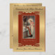 Eine traditionelle katholische Ordination des Heiligen Priestertums Einladung mit einem schönen traditionellen katholischen Bild eines Priesterknies auf dem Altar, das das Heilige Gotteshaus der Messe mit Jesus neben ihm bietet. Der Hintergrund ist ein goldener Schimmer. Alle Texte und Schriftart können geändert werden.