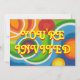 Groovy Baby! Einladung mit einem wirbelnden psychedlic Regenbogenmuster Hintergrund und gelbem Text. Ein gelbes, orangefarbenes, rotes, blaues, grünes, rosa, lila und weißes Design, mit dem Sie Ihre eigenen Texte, Bilder und Ideen individuell gestalten können. Aus einem digital verbesserten Bleistift, der von Jess Perry gezeichnet wurde.
