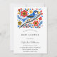 Feiern Sie die bevorstehende Ankunft eines kleinen Mädchens mit dieser charmanten, böhmischen Babydusche, die mit Aqua-Blume, Ästen und Grünpflanzen dekoriert ist und neue Anfänge symbolisiert. Süßes Aquarell, blauer Muttervogel, der auf dem Ast sitzt, Rückseite zeigt handgemalte Aquarellmuster, die wunderschön rhymisch klingen