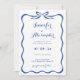 Die Blue Bow Wedding Invitation Card ist eine charmante Mischung aus Vintager Laune und moderner Eleganz, ideal für Paare, die eine einzigartige und unvergessliche Ankündigung für ihren besonderen Tag suchen. Diese Einladung enthält eine atemberaubende königsblaue Farbpalette, die ein Gefühl von echter Eleganz hervorruft, das die Bühne für eine wirklich unvergessliche Hochzeitsfeier Set. Im Mittelpunkt der Einladung steht ein handgezeichnet Bandbogenrahmen, der als Mittelpunkt des Designs dient. Dieses skurrile und dennoch elegante Detail fügt der Einladung eine Touch von Romantik und Verspieltheit hinzu, die die Freude und Spannung des Ortes erweckt. Der Bugrahmen umschließt die Ehereteilen und zeichne die Aufmerksamkeit auf die wesentlichen Informationen mit lässigem Coquette-Flair. Die Typografie, die während der Einladung verwendet wird, ist sorgfältig ausgewählt, um die Gesamtästhetik zu ergänzen. Elegante moderne Typografie wird mit trendigen Drehbüchern gepaart und schafft ein harmonisches Gleichgewicht zwischen klassischem und zeitgenössischem Stil. Diese Kombination von Schriftart verleiht dem Design visuelles Interesse und Tiefe und sorgt gleichzeitig dafür, dass die Hochzeitsdetails klar und schön vermittelt werden. Die Vintagen und Retro-Elemente fügen sich in das Design ein und verleihen dem Ganzen ein Gefühl von Nostalgie und Charme. Vom handgezeichnet Bogen bis hin zum skurrilen Drehbuch, jedes Detail der Einladung strahlt einen zeitlosen Anklang aus, der zugleich elegant und einzigartig ist. Die Verwendung von Royalblau als Primärfarbe verstärkt das Gefühl von regaler Eleganz und ergänzt die Ästhetik insgesamt um eine moderne Drehung. Die reiche Farbe vermittelt ein Gefühl von Luxus und Raffinesse und ist somit die ideale Wahl für Paare, die mit ihren Einladungen zu Hochzeiten gewollt haben. Die Blue Bow Wedding Invitation Card ist ideal für Paare, die eine Mischung aus Vintagem Charme und moderner Eleganz suchen. Sein einzigartiges Design, seine skurrilen Details und seine elegante Typografie machen es zu einer herausragenden Wahl für eine Hochzeit, die Kreativität, Stil und Romantik wertschätzt.