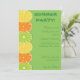 Einladung von Zitrusfrüchten. Diese fruchtige Sommerkollektion mit einer hellgrünen Party Einladung mit einer Reihe von Orangen, Zitronen und Limetten auf der links Seite der Karte. Ideal für Cocktail-Partys oder Partys am Swimmingpool.