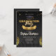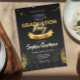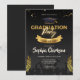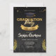 Eine einfache und klassische Einladung mit Graduierungskappe, Konfetti und Goldlaurel auf schwarzem Hintergrund