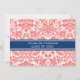 Graduation Party Einladung individuelle Karte in eleganten und raffinierten pfirsichfarbenen rosa, dunkelblau-weiß und weiß klassischen Vintagen Blumenstaub Muster. Passen Sie diese Akademie-Ankündigungskarte an, indem Sie das Jahr Ihres Abschlusses und Ihre Graduiertenparty-Details hinzufügen.