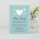 Schönes weißes Silbergeschirr und herzhafte China-Geschirr - lädt Ihre Gäste zu einer Verlobung-Feier mit "Essen, trinken und Verheiratet sein!" ein. Weiße Elemente, dunkle Schokoladenbraun Typografie, auf einem weichen Aqua-aquamarinen Hintergrund, ist dieses Design einfach unterschätzt und elegant.