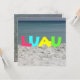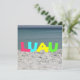 Eine Einladung mit einem Foto mit weißem Sand und blauem Wasser. Im Text steht "LUAU" in multicolor islander Schriftart. Gegenüber befindet sich das Foto des blauen Meerwassers. Passen Sie die Details Ihrer Veranstaltung an.