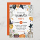 Machen Sie sich bereit, Ihre Gäste zu einem Halloween-Bash mit einer schwarz-orangefarbenen Party Einladung einzuladen, die einen spurigen Rahmen voller Halloween-Symbole auf weißem Hintergrund aufweist. Personalisierte schwarz-orange Typografie.