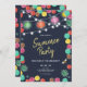 Eine sommerliche Party Einladung mit handgeschriebenen, bunten Punkten und Lampionen