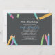 Eine Tafel, farbige Bleistifte, ein Bleistiftschärfer und ein Herrscher nehmen die Geburtstagseinladung dieses Lehrers auf. Ändern Sie das Hintergrundjahr, um das Geburtstagsjahr, das Sie feiern, wiederzugeben.