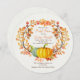 Eine wunderschöne, runde Einladung mit einem Grunge-Hintergrund mit einem festlichen Herbstkranz mit Herbstlauben, Kürbissen und Eicheln. Als Brautduscheinladung präsentiert, ist es perfekt für alle fröhlichen Herbstfeiern. <br/>()<br/>Die Karte lässt sich einfach mit Ihrem Text, Schriftart, Schriftart, Papierform und der Auswahl von sechs Papiertypen anpassen.<br/>() Nicht genau das, was Sie suchen? Alle unsere Produkte können auf Ihre Bedürfnisse zugeschnitten werden, ohne Aufpreis.<br/>() Kontaktieren Sie uns einfach unter askpixieprints@aol.com.<br/>() Koordinierung der Produkte verfügbar: frag uns einfach!
