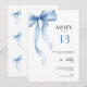 Machen Sie den besonderen Tag Ihres Teenagers mit unserer Einladung zum 13. Geburtstag mit einem schönen blauen Schleifendesign noch unvergesslicher. Diese elegante und klassische Einladung ist eine bearbeitbare Vorlage, die Sie leicht personalisieren können, was sie perfekt für die Feier einer 13-jährigen Mädchen macht. Mit ihrem minimalistischen Stil und dem charmanten Watercolor-Coquette-Element ist diese Einladung nicht nur visuell ansprechend, sondern auch praktisch, da Sie mit nur wenigen Klicks eine stilvolle blaue Band-Einladung senden können. Wählen Sie unsere druckbare Karte, um sicherzustellen, dass jedes Detail hervorsticht, wenn Sie Freunde und Familie zur Feier einladen. Feiern Sie ihren Eintritt ins Teenageralter mit einer atemberaubenden Einladung.