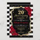 20. Hochzeitstag Einladung Elegantes Schwarz-weißes rotes Design mit Imitat Glitzer. Schwarzweißstreifen mit rote Rosen.