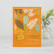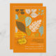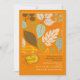Eine helle und fröhliche Herbstblatt-Einladung mit Blätter in Weiß, Blau, Gelb, Grün und Braun auf orangefarbenem Hintergrund. (Vecteezy.com - Herbst und Herbstkarte Vector Vorlagen von glückymeluv). Die Karte lässt sich leicht mit Ihrem Text, Schriftart, Schriftart, Papierform und der Auswahl von sechs Papiertypen anpassen.